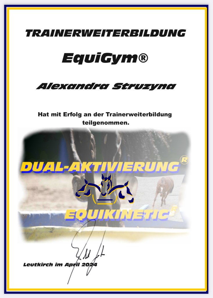 Im Mai 2024 habe ich die Qualifikation zum EquiGym® Trainer absolviert und freue mich, dass ich euch und euren Pferden diese tolle Trainingsmethode anbieten kann.